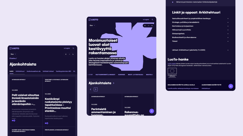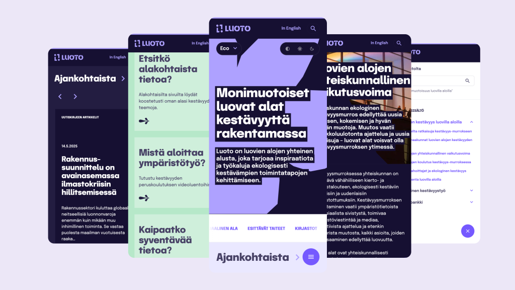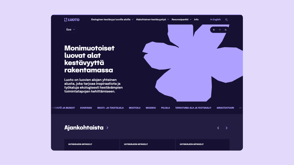 Yhdistimme strategisen palvelumuotoilun ja ekologisen teknologiaosaamisemme luodaksemme Uudenmaan liiton Luoto-hankkeelle digitaalisen alustan, joka vauhdittaa luovien alojen kestävyysmurrosta. Loimme helppokäyttöisen ja innostavan tietopankin, joka palvelee, yhdistää ja tukee koko toimialaa.