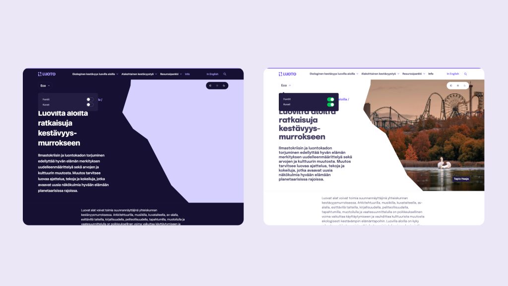 - Eco-mode: Käyttäjä voi aktiivisesti pienentää sivuston kaistanleveyden käyttöä ja hiilijalanjälkeä valitsemalla ekologisemman tilan. Tämä tila lataa sivut kevyemmillä järjestelmäfonteilla ja käsittelee kuvat vähemmän kaistaa kuluttaviksi.
