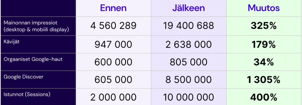 Google Discover tuotti ennen julkaisua 605 000 sivulatausta ja julkaisun jälkeen 8,5 miljoonaa sivulatausta. Discoverissa muutos on ollut suurin.