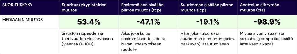 Sivustonlaajuisesti Google PageSpeed Insightsin antama Performance Score parani mediaanilla laskettuna 53%.