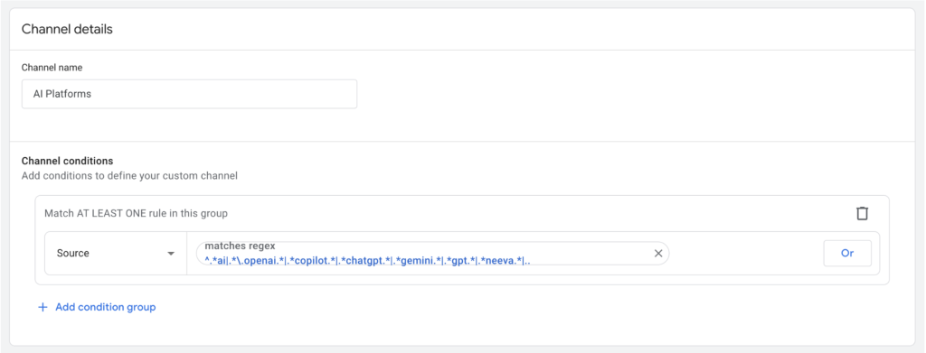 GA4:n hallinnassa on osio nimeltä ”Default Channel Group” (Oletuskanavaryhmä). Saattaa tuntua houkuttelevalta lisätä uusi tekoälykanava suoraan sinne. Tämä ei kuitenkaan ole suositeltavaa.