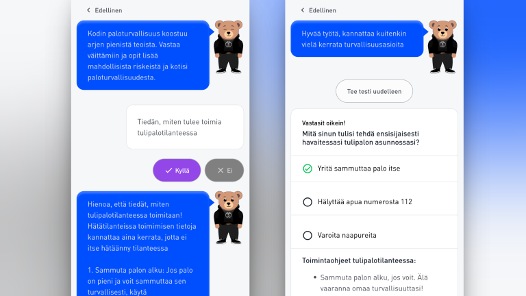 In addition to the AI Teddy, the service features lightweight gamified elements, such as a home risk assessment and a trivia-style fire safety quiz: