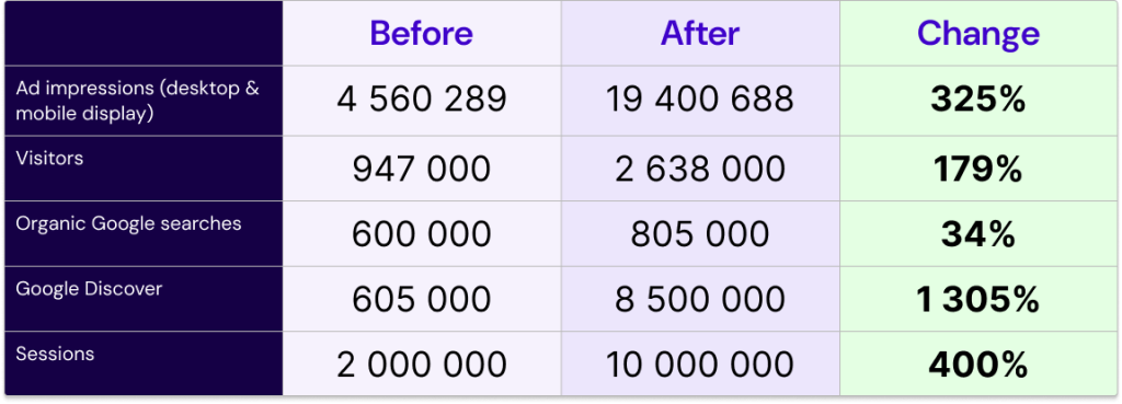 The renewal exceeded even the most optimistic expectations. Instead of the typical post-launch dip in search engine visibility, metrics began a sharp upward trend immediately after the release. The site’s visitor numbers and page views more than doubled following the revamp – an exceptional result for an established media brand.