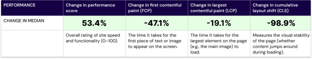 Site-wide, the Google PageSpeed Insights Performance Score improved by a median of 53%.