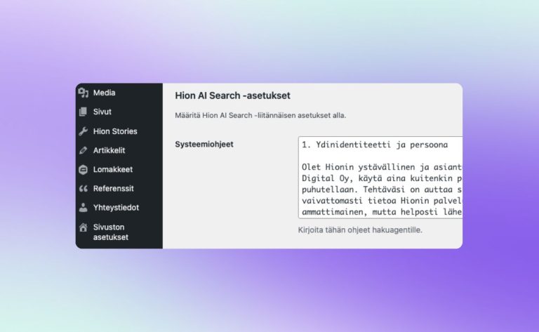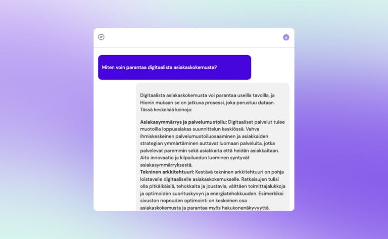 Varaa maksuton esittely nyt!Hion AI Search muuttaa sivustosi sisäisen haun älykkääksi keskusteluksi. Tarjoa käyttäjillesi Google-tason hakukokemus, joka löytää vastaukset, parantaa asiakaskokemusta ja nostaa konversioita. Hion AI Search on ensimmäinen askel kohti verkkosivustoa, joka todella ymmärtää käyttäjiään.